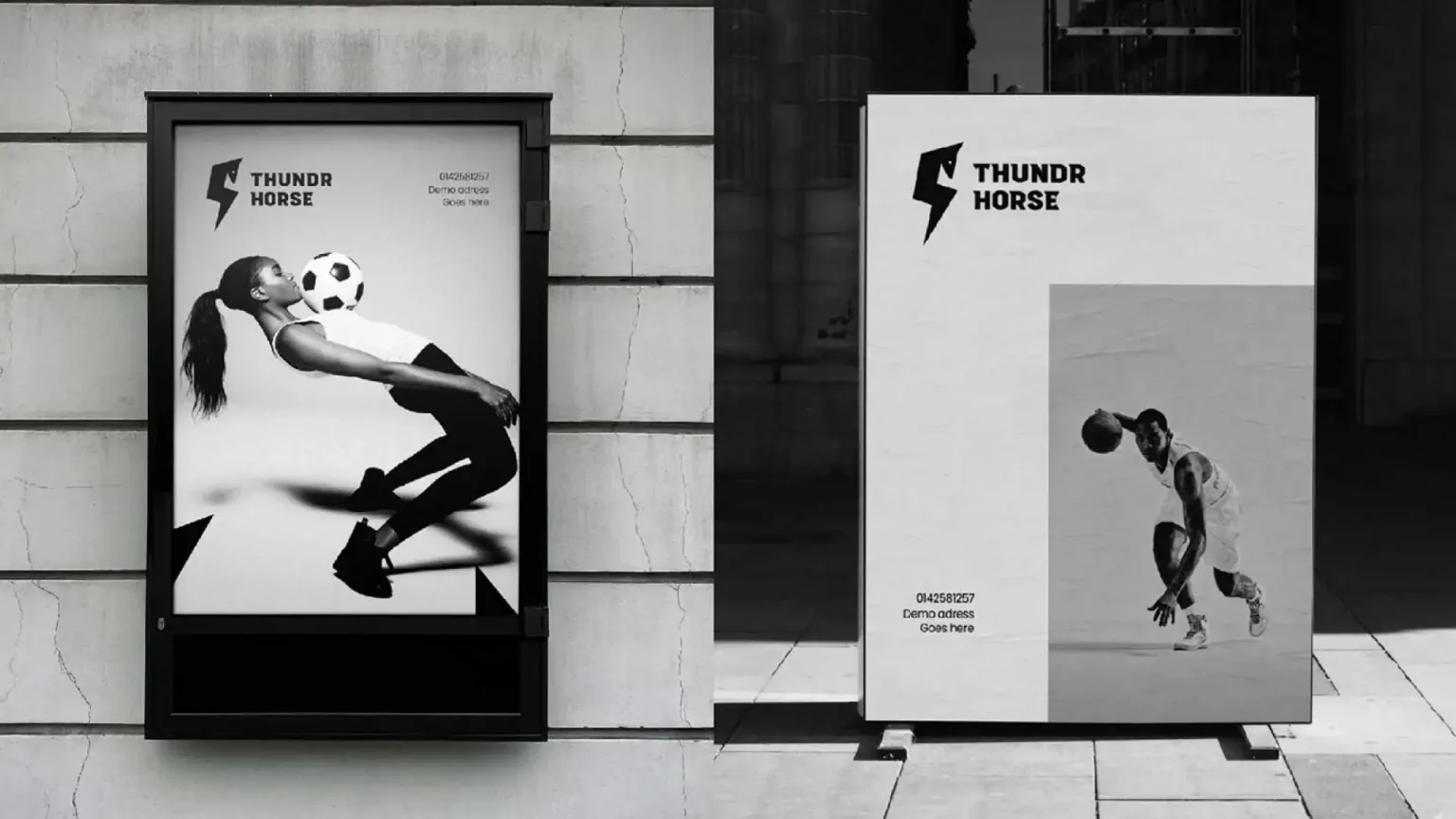 A bold fusion of power and energy, the Thunder Horse logo combines a lightning bolt with a horse silhouette, symbolizing strength and speed. Its minimalist, geometric design ensures versatility and modern appeal, making it perfect for an active, urban audience. The black-and-white palette adds to its sleek, timeless aesthetic, allowing it to stand out across all branding platforms.